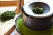 碾臼(ひきうす)は、茶臼専門の職人により目立てされた正式な茶臼を用いておりますので、碾きたての抹茶本来の風味と香りをお楽しみ頂けます。