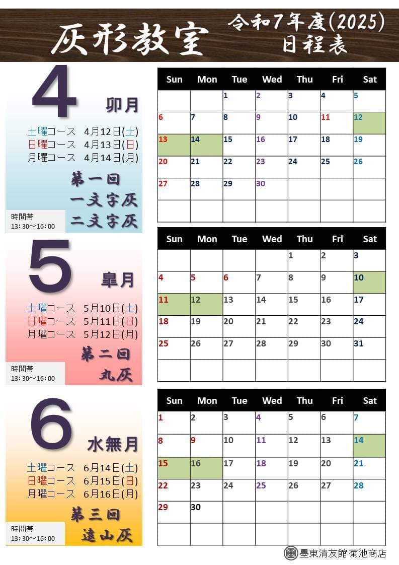 | 内 容 | 【全3回】 第1回 一文字灰・二文字灰(※裏千家は二文字灰となります。) 第2回 丸灰 第3回 遠山灰 |