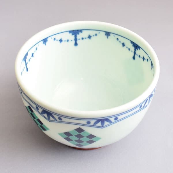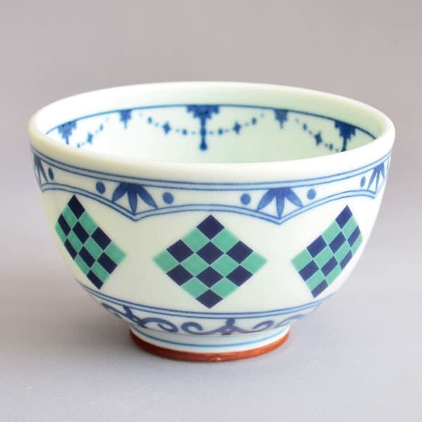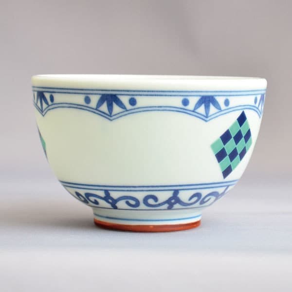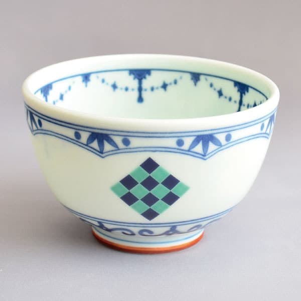 加藤良峰 作 染付織部市松文茶碗(角文)