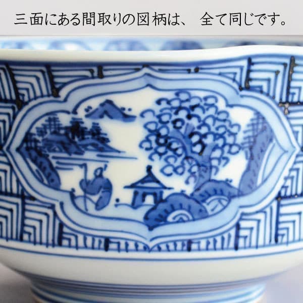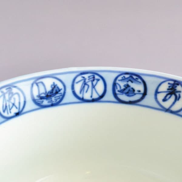 茶碗の外側には、全体的に幾何学紋と四面に山水が描かれ、内側の縁周りには糸輪で福禄寿や絵柄が描かれています。